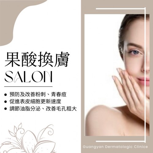 果酸換膚是種特別的肌膚再生術,利用最精良的水果酸(甘醇酸、檸檬酸、水楊酸、乳酸) 來幫助皮膚去除堆積在外層的老化角質、促進表皮細胞更新的速度並能促進真皮層內彈性纖維、膠原質再生、平衡肌膚油脂分泌、幫助清除在皮膚毛孔裡的老廢角質、油脂等,可調理毛孔、讓皮膚更有彈力。並可以減少外在環境與角質層的接觸,提升肌膚舒適度、強化表皮防禦能力,重新給予您一個細緻亮麗的肌膚。對應症狀油性肌膚、痘痘肌膚、老化肌膚